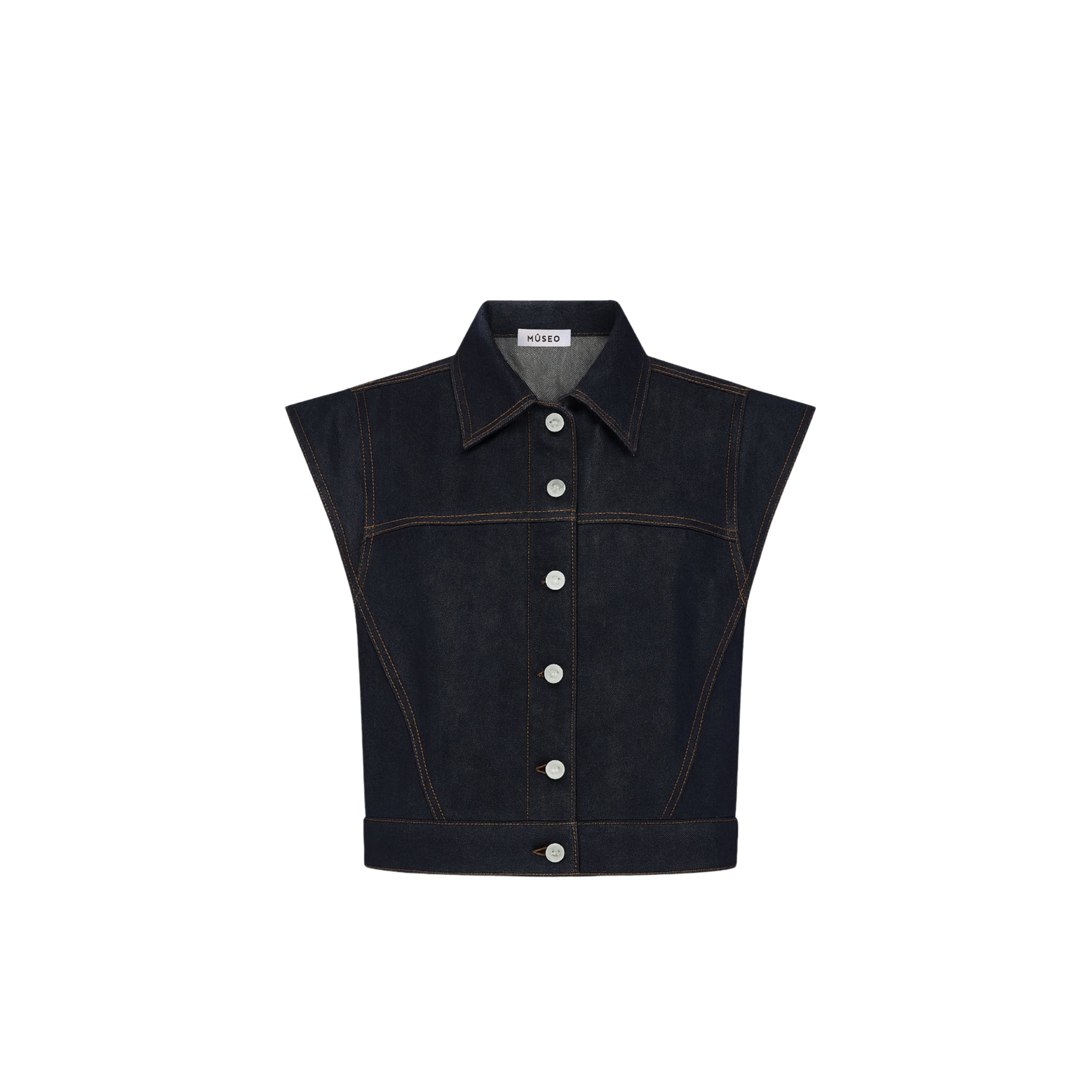 Dark-indigo denim vest with exaggerated batwing shoulders, metal button front, side-snap vents and contrast top-stitching —dry clean only.
